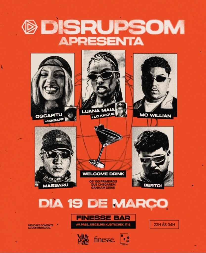 O selo Disrupsom realiza, no dia 19 de março, em São Paulo, uma noite que celebra a força coletiva de seus artistas. O evento reúne Massaru, OGCapitu, Luana Maia, MC Willian e Bertoi em um line-up que reflete a diversidade e a potência da nova cena urbana.